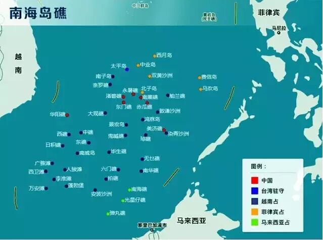 南沙群岛:在四大群岛中,岛礁最多,面积最广。被“五国六方”(中国、越南、菲律宾、马来西亚、文莱及中国台湾)分别控制。美国、日本、印度积极插手争端。
