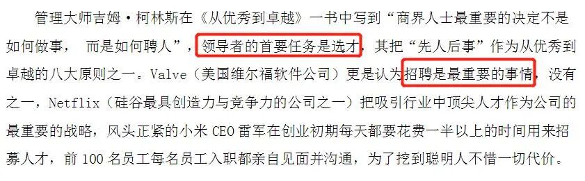 只有人才的选拔针对未来,必须根据过去预测,除了工作完成情况,《管理大纲》强调了要通过事实,合理评价人才的进取心和责任感,类似面试。