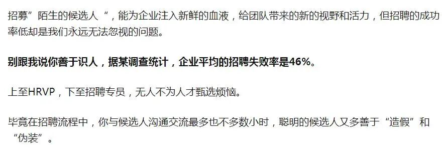 网上说有调查,公司的人才招聘失败率达到46%!又看到管理大师说,一般经理人员招聘成功率顶多有三分之一,另外三分之一凑合,剩下三分之一是彻头彻尾的失败!这下我有点释然了,不是我眼光太差,是看人这事本来就很难啊。所以说“千里马常有,而伯乐不常有。”