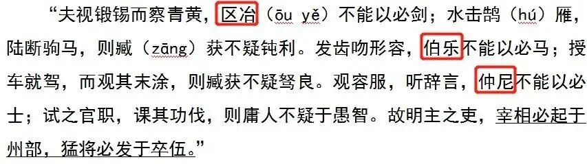 我又想起韩非子讲看人的困难,圣人都容易走眼!下面标红的欧冶是巧匠,伯乐擅相马,孔子是圣人,只看外表他们都没法确定宝剑好不好,马好不好,人才水平咋样。但如果实际试一试,就是傻子也能看出来。所以韩非子的结论是:不要主观臆断,要靠实践检验。