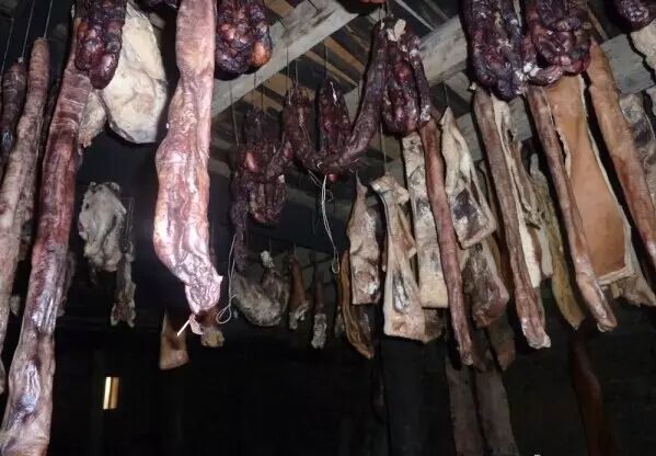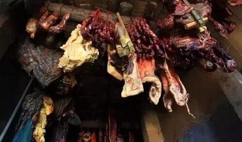 羌族也善于制作各种腊肉,味道非常棒。每一间碉楼里面都挂着腊肉,供给一年生活消耗。传统的羌家腊肉,用自然放养的山猪肉制成,烟熏要用香叶树的树枝和生柏枝做燃料,一种自然香气也随着烟熏悄悄渗透肉里,待水分消失能渗出油来,转小火烟熏片刻,然后在通风处挂上,风干的时间愈久味道愈香。有两种吃法,一是火烤,二是清蒸,无论哪种吃法,味道都很香美。一逢羌族的重大节日或婚嫁等大事,男女老少都喜欢聚集一起大口大口喝着自酿的青稞大麦发酵而成的咂酒,大块大块吃着老腊肉,充分体现了羌族人朴实厚道、粗犷豪放的性格特点。