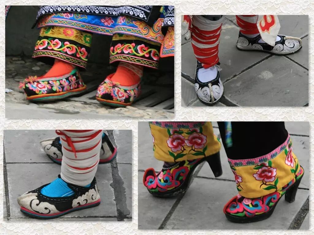 羌族服饰。多以自产的火麻经加工后纺线织成,俗称“麻布衫”,或以牛羊毛吊线后织成,俗称“衫”,亦有布衫,以青色为多。腰间男束腰带,女束花围腰,外穿无袖羊皮褂子,脚缠裹脚,穿草鞋或“云云鞋”(羌绣布鞋)。