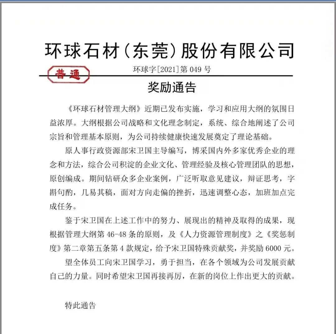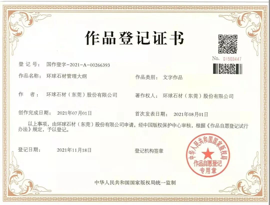近些天,我主导编写的公司基本法《环球石材管理大纲》获得国家版权局的著作权证书了。至此,这份对公司非常重要的1.1万字文件,这件我一年中最重要的事,终于尘埃落定了!
