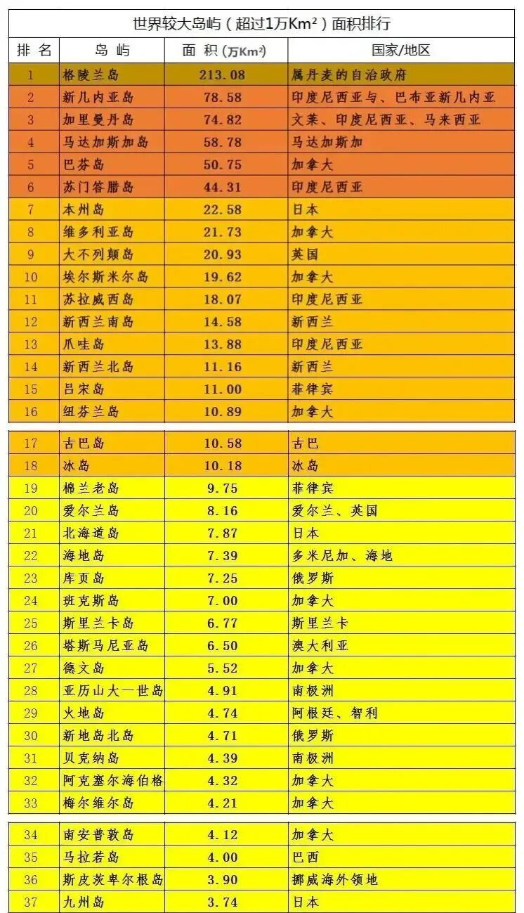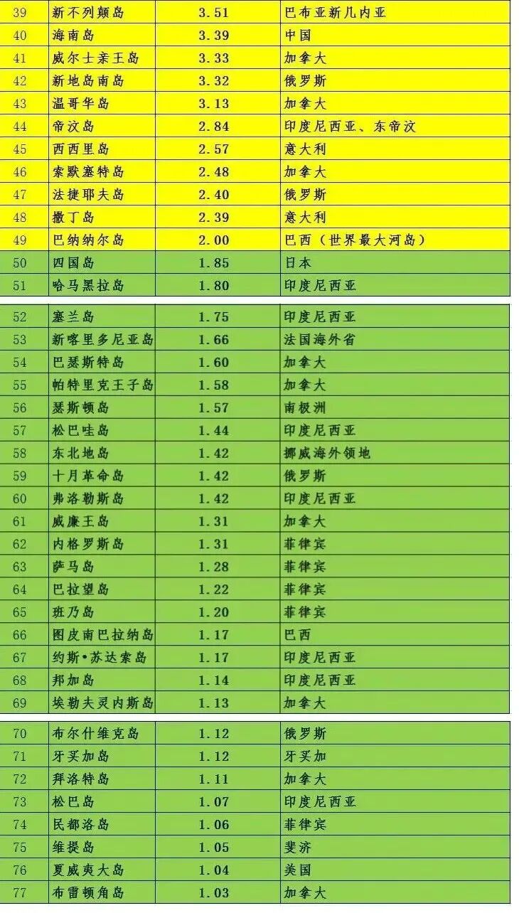 世界上可能有几十万个岛屿,台湾岛面积约3.588万Km²,在世界岛屿中排名第38位,绝对算大岛!如果台湾算小岛,那其他岛算什么?就像几十万人高考,你孩子考了38名,说句成绩领先不过分吧?(下表选的数据有点)