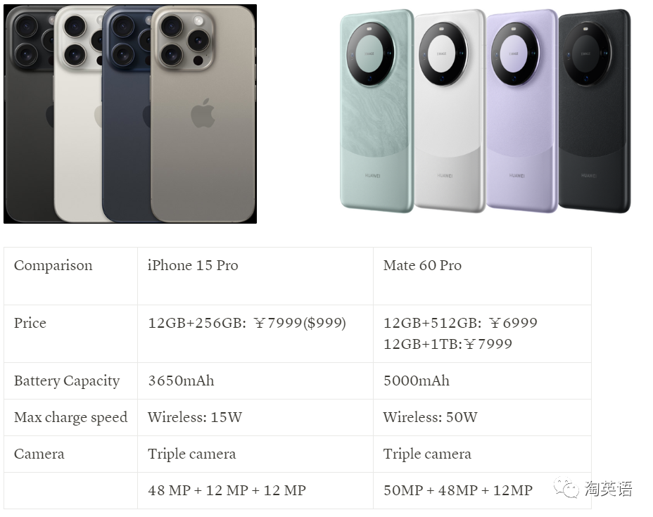 华为mate 60 pro的三个摄像头也比苹果 15 pro的像素高。