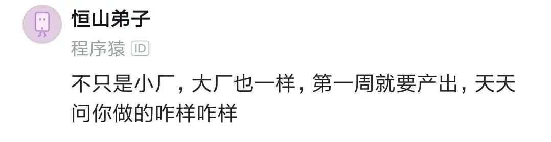 不管大厂小厂都是一个尿性,你以为去了大厂就好了,只是换了个地方,重复昨天的事情。现在是什么行情,心理还没数么,不要总是说公司规模的问题,大厂是无数子集的小公司组成,最多就是人不同。