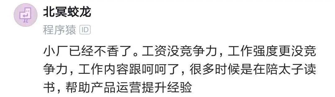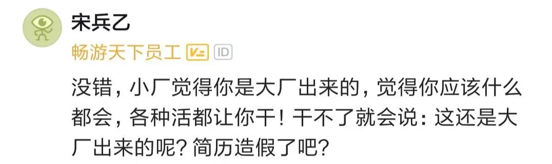 越小的地方对人要求越高,越大的公司其实更轻松,现在不是说大厂小厂的问题了,而是你能去哪里的问题,总说企业的问题,只能是不上班最好。从前你说不想去,还行,现在不去,是真没地可去了。