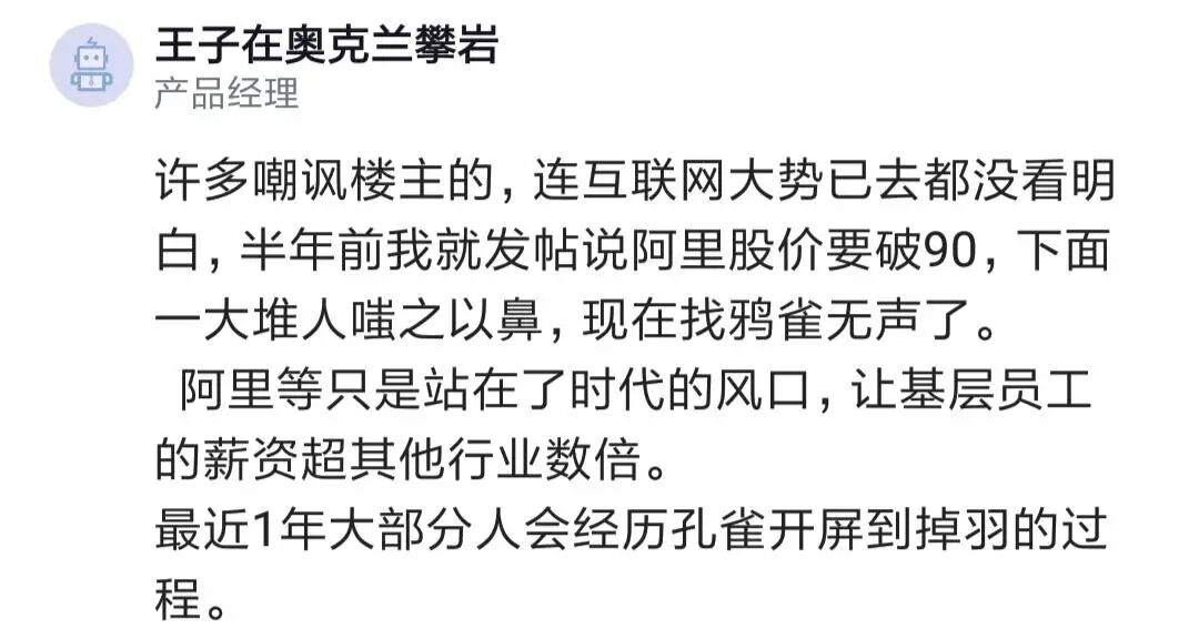 时代不好了,平台不好了,过去你说自己再牛,市场也不会有人愿意高价用了。薪酬这个东西,是受行情影响大,现在大厂的股价怎么样,业务怎么样,大厂都不好了,其他行业能好到哪里去。