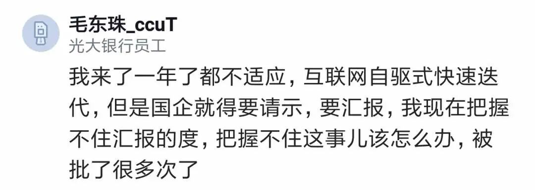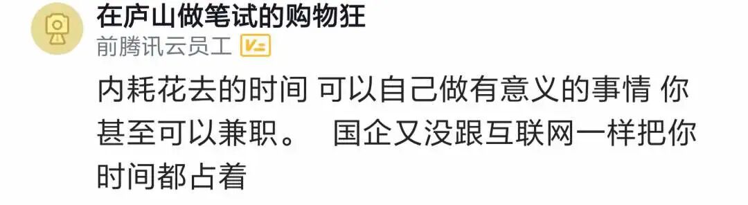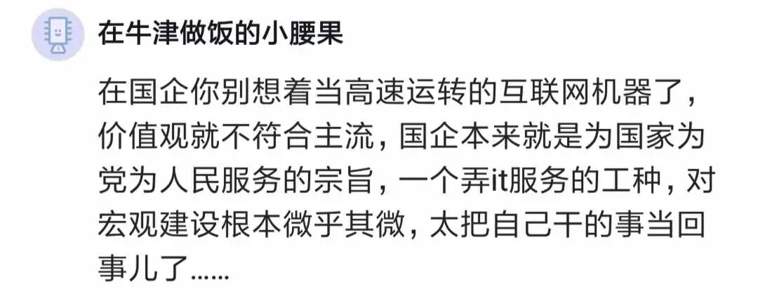 有人的地方哪里都一样,互联网它只是为了适应市场而做的一些快速响应,那么国企它不需要这么大的响应,那么他的工作模式和节奏就是相对缓慢的。公司性质和市场属性,决定公司的行为。