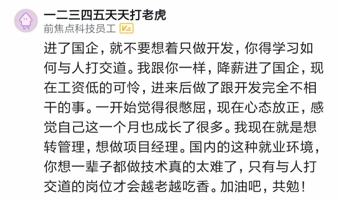 在国企或者互联网都可以做自己想做的事情,真想做事,跟你在哪里没关系,跟你能做什么有关系。市场是公开透明的,有工作也可以干其他的,有的人在公司上班只是幌子,其实真正来钱更多的是自己能做市场。人总是贪心的,得到这个又念想那个。