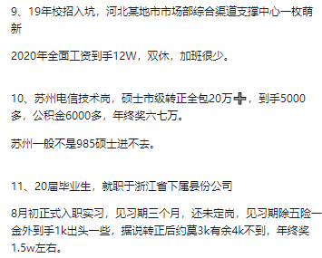 看一看这些人的薪酬,看一看他们做了什么岗位,可以给自己一个参考。同样是去电信,岗位不同,薪酬差异会特别大。一般来讲公司的研发部门待遇会高一些,如果是业务岗,如果不是精英,待遇肯定会低。电信的研究院门槛高,电信的业务员门槛相对低,薪酬高低受学历的影响。