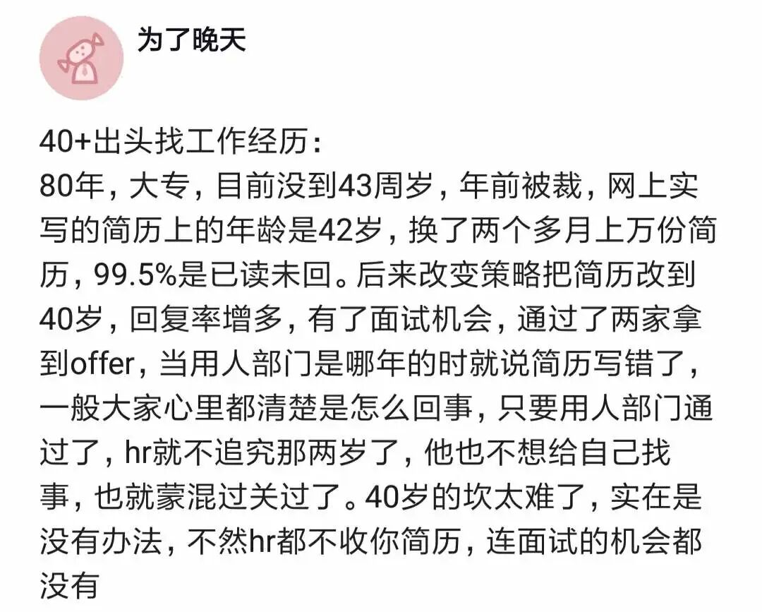 年龄是不可逆转的,人家能到40岁,还能找到工作,那确实是有实力的。投递了上万分简历,99.5%是已读不回,自己感受下。市场其实并没有那么差,只是新人和年龄大的,不是那么好找工作。