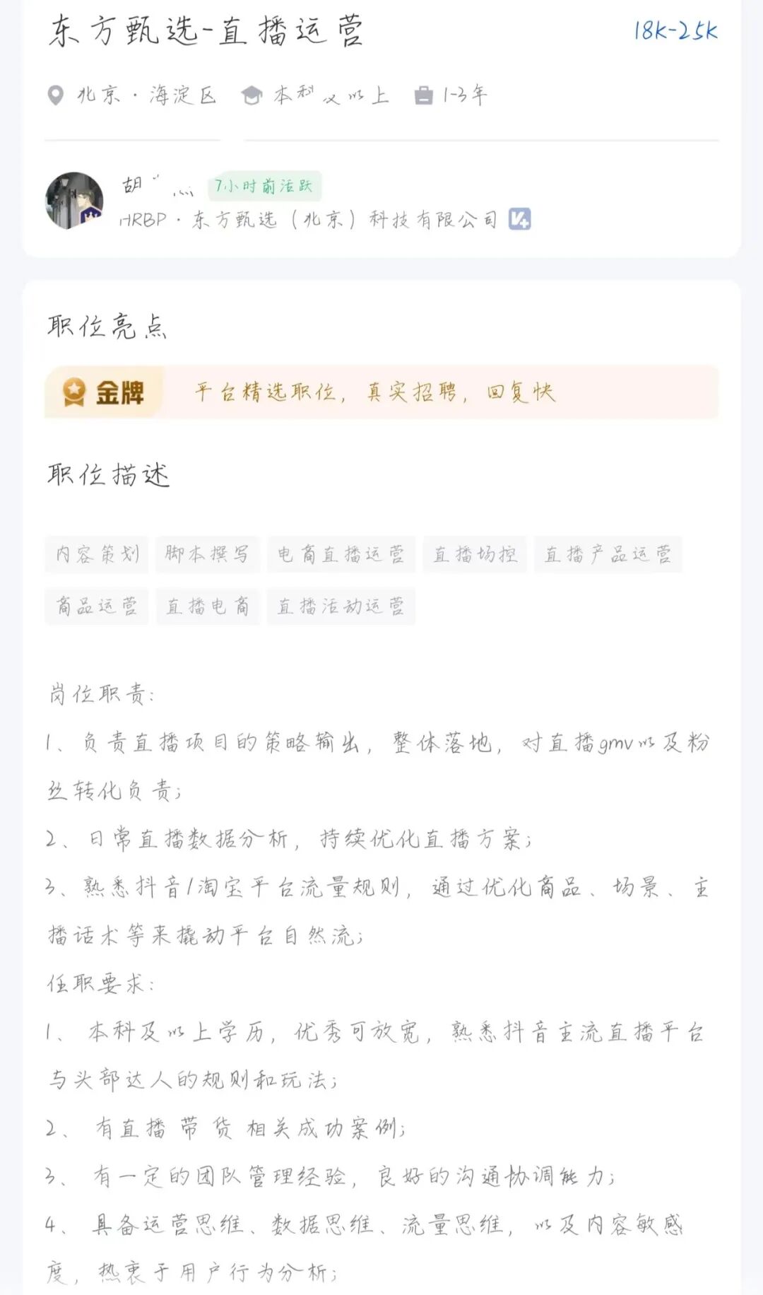 看看东方甄选给出的招聘薪酬和招聘要求,要多去一些职场社区,在那里关注一些行业动态,在网红公司待过跟没在网红公司待过,区别是很大。对于招聘要求,看看就行了,那种活并不复杂,关键是看人家要不要。招聘就是说的复杂,做的简单,最重要的就是能实时问题实时处理。周围的同事,好几个都去了这些网红公司,现在生活过得多姿多彩。