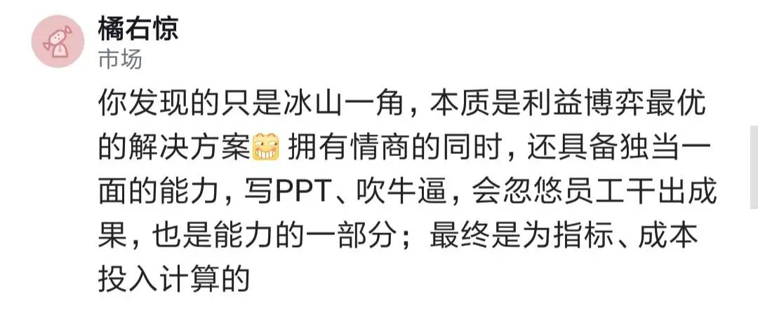 业务才是最关键的,当你不能为企业继续创造价值,你的情商再高也不行,公司都不行了,你啥也干不了,你觉得企业会留你吗?拍马屁有效的前提,也是能把事情干好才行。