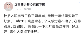 不同部门是有差异的,也是有行业共性的,只要在核心的业务线,想轻松是不可能的。跳槽去外面,钱少的工作,现在也不一定就轻松,只是相对的。到处都很卷,钱不好赚的时候,只能是卷人的概率更大。