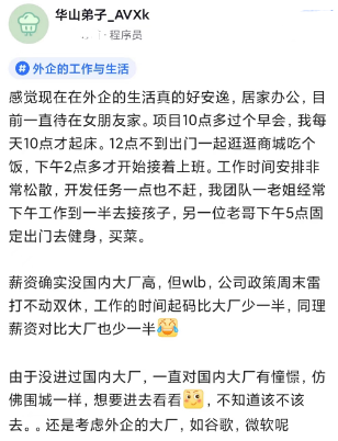 外企的工作状态确实很令人向往,真正做到了生活工作两不误,薪水方面确实不如国内大厂,但工作时间也会少很多,算起来时薪也许差不多。好的地方是有共性的,不好的地方也是有共性的。