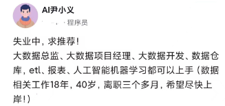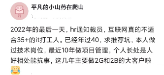 好多大龄求职的,真好工作,就不去网络求职了,自己身边的朋友就能内推,说明还是不够厉害。一个人经验丰富,能力很强,你觉得求职会很难吗?只能上手做项目的人,市场是不缺的,需要复合型的人才,懂市场懂技术懂商业懂运营等,这类人在市场更容易找到工作。