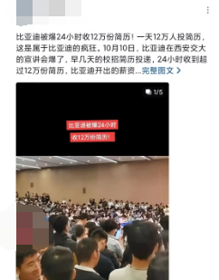 24小时12万份简历,这数字夸张吗,劲爆吗,你说这样的情况,比亚迪不采取措施,简历筛选周期都要加长,这对企业就是成本。总看到有人问比亚迪到底怎么样,现在别说怎么样了,连门都进不去了,里面是好是不好,跟很多人关系都不大了。