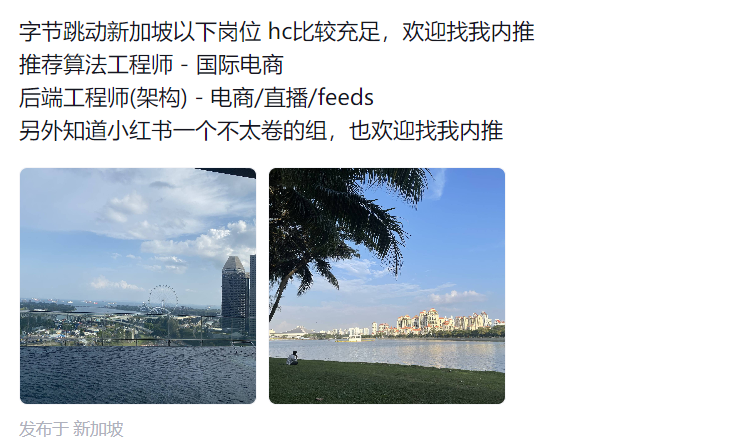 有人说自己没在国外读书,怎么去海外发展,这个就提供了很好的思路,进入大厂就行了。每个人对新加坡的感受不一样,别人的感受也许会不同,如果真的向往海外,可以拿华人多的国家做跳板。