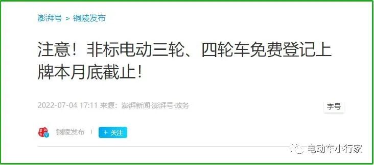 根据《关于加强低速电动车管理的通知》明确,安徽铜陵自2022年5月10日起,在市区范围开展内非标电动三轮、四轮车集中登记上牌工作,截止上牌时间为2022年7月31日,这也意味着,8月1日停止铜陵非标电动三轮、四轮车免费登记上牌,还未上牌的车主要抓紧办理了。