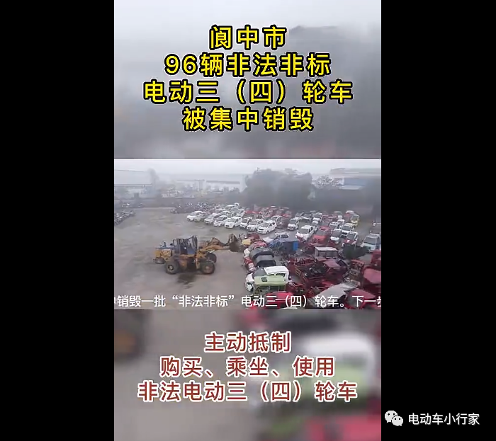 但对于这类老年代步车的管理,自从电动车规范化以来,也愈加严格,各地加强违规上路的老年代步车治理、查扣,并且,经常能够看到各地对于违规的老年代步车集中销毁的消息,在2022年12月22日,四川阆中市展开96辆非法非标电动三四轮车的集中销毁。