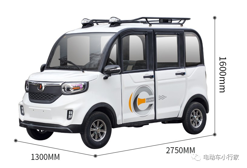 从外观来看,它和电动三轮篷车十分相似,只是多了一个轮胎而已,整车尺寸为2750×1300×1600mm,明显长于上款车型,车的前脸为大灯和雾灯两上两下,中间有镀铬装饰物,并且有着车标,让车辆具有一定的辨识度,另外,车辆同样具有实用性比较强的行李架装置。