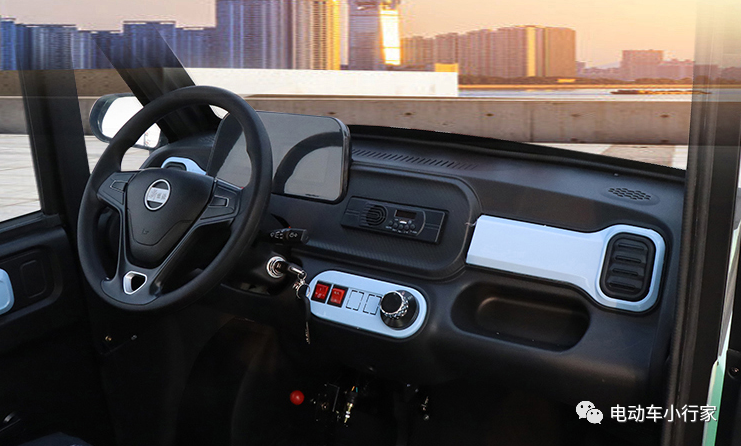 内饰方面:车辆的内饰相对比较简约,车辆的驾驶方式有车把式和方向盘式可自由选配;车辆由于比较小巧,采用的为1前2后的3座设计,双层加厚座椅,乘坐更舒适;另外,副驾驶座椅有大空间储物装置,车顶有螺旋双风扇等实用配置。