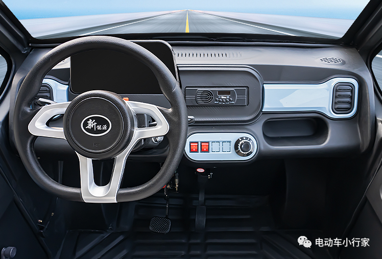 内饰方面:车辆虽然小巧,但考虑到实用性,还是设计了4人座空间,二胎家庭接娃也有足够的空间;车辆是方向盘设计,更有操纵驾驶的感觉;座椅和中控台之间,留了足够的空间,让腿脚放置更舒适;中控台搭载了大屏液晶仪表,支持倒车影像、音乐播放器,让驾驶不单调。