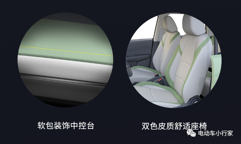 内饰方面:车辆是软包装饰的中控台,舒适感十足;双色皮革座椅,不仅摸起来舒适,坐起来也更舒适;另外,车内的设计为“国标”要求多是4人驾乘空间,但作为比普通的低速电动车略大一些的车型,它拥有15处储物空间,并且有420L-1250L灵活后备箱容积,有足够的空间放置出行随车携带的物品。