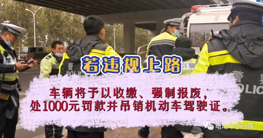 从视频中可以看到,交警提醒,若不符合标准的电动四轮车(老年代步车)违规上路:车辆将予以收缴、强制报废,处1000元罚款并吊销机动车驾驶证。