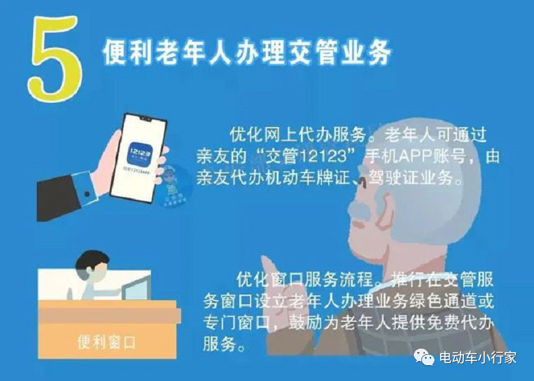 值得庆幸的是,现在也确实在往这个方向发展,比如在公安部推出的便利措施修订中,就特别提到便利老年人办理交管业务,其中包括:老年人可以通过亲友的手机代办牌照、驾驶证业务;推行在交管服务窗口设立老年人办理业务绿色通道或专门窗口,鼓励为老年人提供免费代办服务。