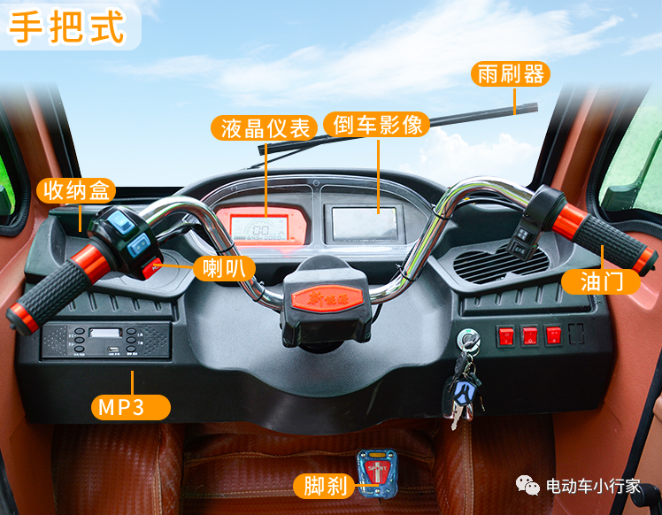 (6)其他的基本配置:标配了USB充电接口功能,不用为手机没电担忧;车辆的电池均为合作的天能、超威大品牌,不用为品质、售后担忧;另外,车辆还有机械爬坡档位、无钥匙启动等配置。
