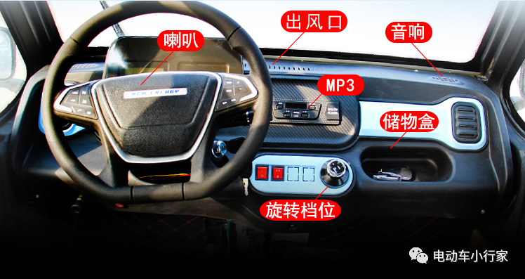 作为一款追求性价比的四轮电动车,这款车内饰是“虽简但全”,车辆是方向盘设计,拥有数字显示屏,虽然并不大,但也具备倒车影像,支持无线广播功能,另外,车辆可以一键启动冷暖风,这一点很实用,其他的还有可折叠座椅,旋钮开关等配置。