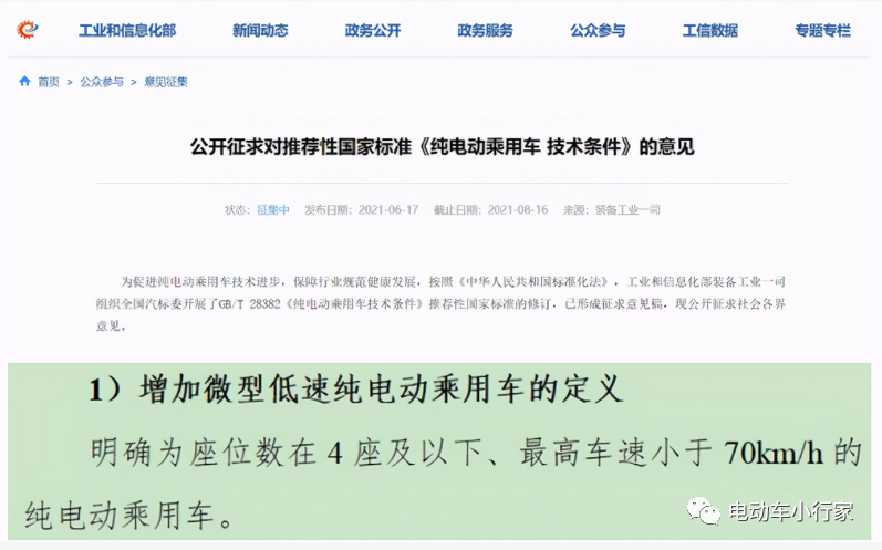 第2个方面:在2021年6月工信部发布的《纯电动乘用车技术条件(征求意见稿)》,明确了低速四轮电动车是“微型纯电动乘用车”的身份,而低速四轮电动车也成为电动汽车行列的一员,因此,它属于“机动车”。