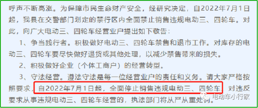 2022年7月1日,山东齐河发布通告,在禁行区内全面禁止销售违规电动三、四轮车,对违反要求从事违规电动三、四轮车经营的,执法部门将从严从重处罚。