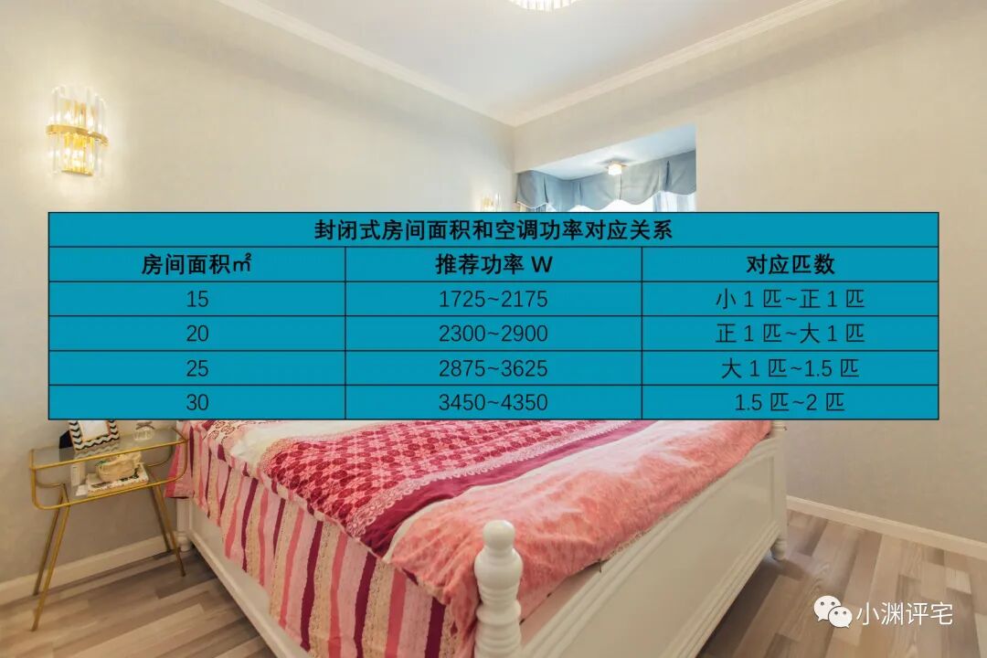 比如20平米的卧室,所需制冷量就是2300W~2900W,对应的匹数是正1匹或大1匹。