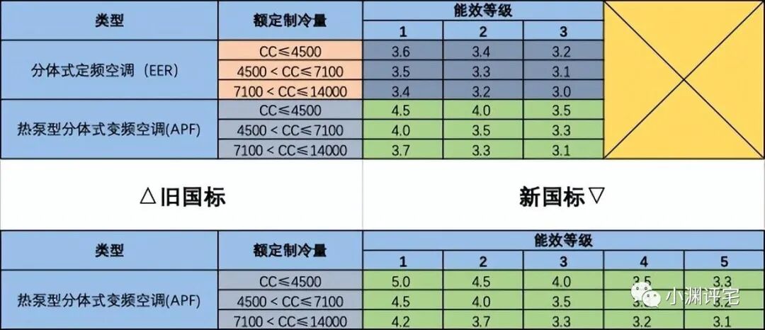 旧国标的能效分三个等级,新国标的能效分五个等级。当然这不是最主要的,新国标最大的改变,是分类标准的升级。