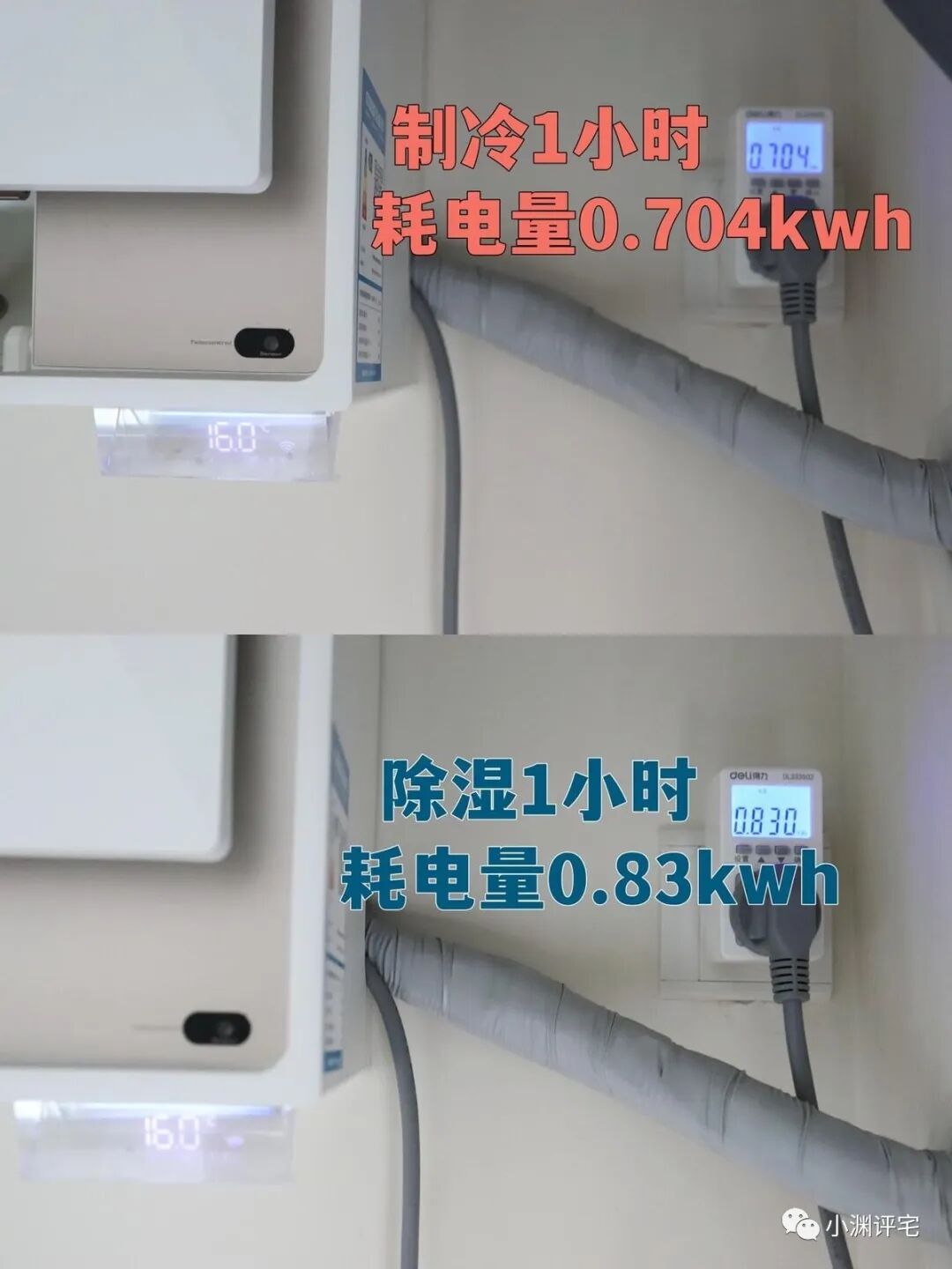 房间里的初始温度都是34度,分别开启制冷、除湿模式一小时,耗电量如下▽