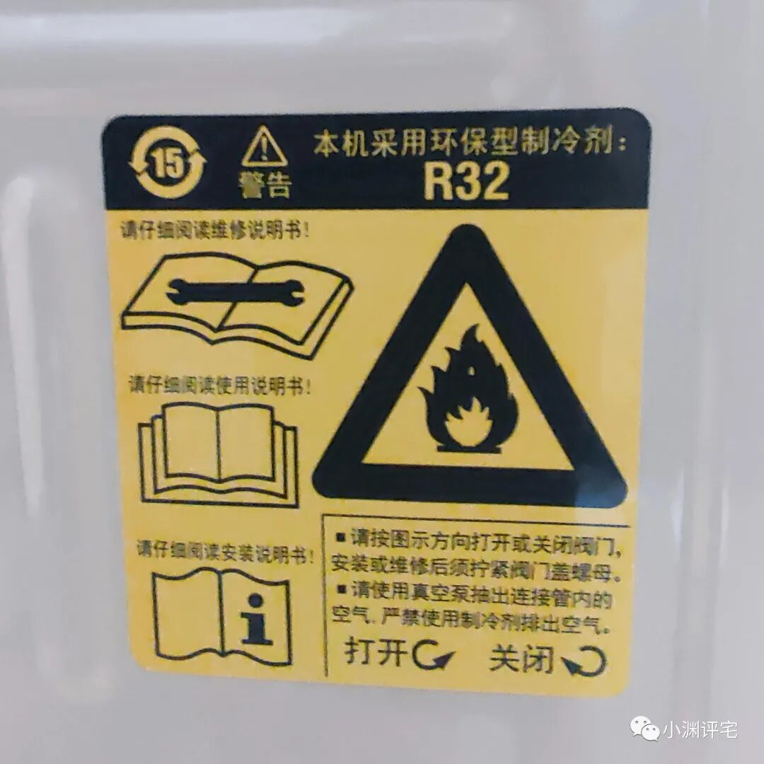 所以使用了R32制冷剂的空调,在室内机、室外机上都会贴一个黄色的火焰标签,用来警示用户。这种制冷剂一旦泄露,在接触到明火以后就容易发生爆炸。