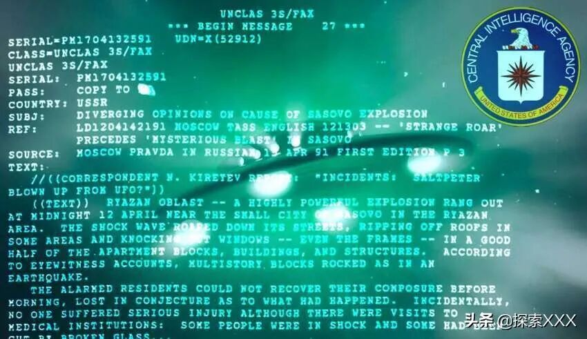 在另一份报告中,CIA官员讨论了俄罗斯小镇萨索夫的一起“神秘爆炸”事件。这个小镇位于莫斯科西南约400公里。1991年,当地居民报告说,他们看到一团“火球”从天而降,随后一股冲击波席卷了整个城市。在报告中研究人员并没有得出爆炸原因,但不明飞行物是一种可能性。