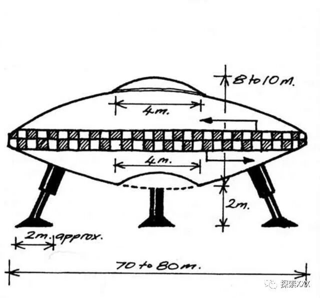 这是一段往下倾斜的道路,因为天很黑,沃尔特不得不带上手电筒,小心翼翼地走向那个巨大物体。随着距离的接近,雾带慢慢散开,他看得越来越清楚了。这个物体非常漂亮,颜色是银色的,直径约80米,用三条腿站立着,腿长约两米,底部约两米厚。不明飞行物沐浴在毛茸茸的白光中,散发着强烈的燃烧的气味。