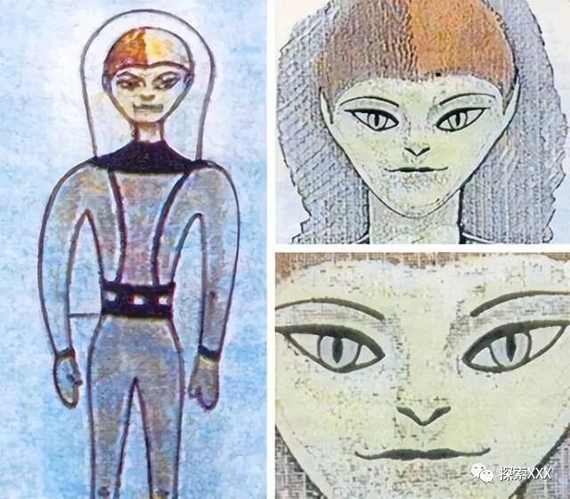 突然,从飞船的中心射来一束大约两米宽的光,颜色在紫色和橙色之间交替。从这束光里,沃尔特看见一个“人”从飞船里下来,穿着紧身的衣服,头上戴着一顶玻璃头盔。这个“人”大约1.60米高。他径直走到沃尔特跟前,直到离他不到一米远,并举起右手向他打招呼。