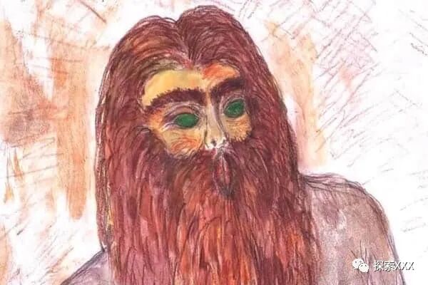 他的长头发,红色的波浪状,垂在身后,越过肩膀一直垂到腰间;他的胡子又长又厚,一直垂到肚子上。他的眉毛很宽,两指粗,横跨整个前额。他的皮肤是浅色的,非常苍白。他的眼睛是圆的,比我们的眼睛要大,眼睛是绿色的,就像开始枯萎的绿叶的颜色。