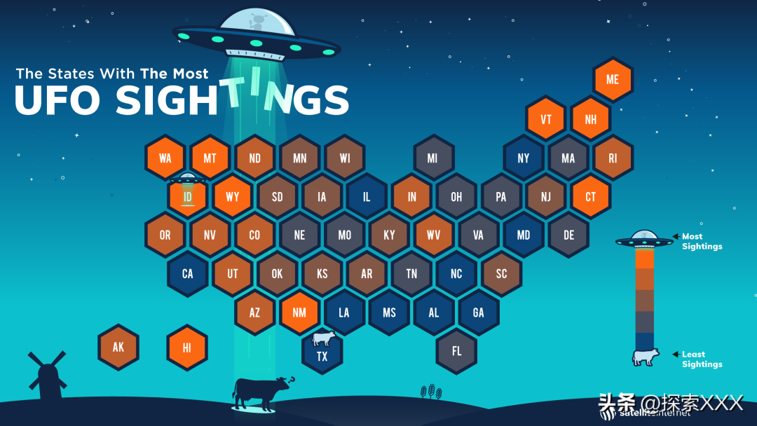 根据统计,在美国,最有可能在怀俄明州和佛蒙特州看到UFO。因为在过去的七十八年里,这两个州分别报告了2854次和2493次目击事件,按人均目击的话,看到的概率接近1/250。