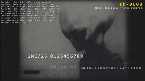 其次是时间码所使用的字体。这个字体与微软2006年发布的字体Consolas类似,只不过多了一些额外的扭曲和模糊效果。在下面的动图中可以看到,在添加效果后得到的时间码(第三行)与原始视频中的时间码(第四行)几乎一致。