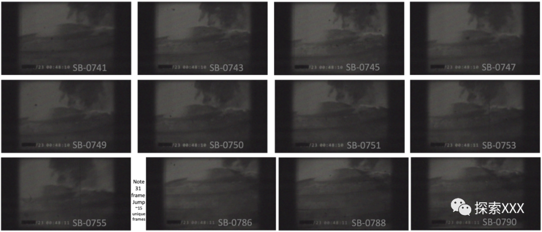 从SB-0741的第一个清晰帧到 SB-0755的31帧跳跃之前,时间大约为1秒。可以看到,烟雾改变形状的时间不是很多,但是有足够的差异,并且这种差异是渐进的变化。在31帧跳跃(大约又跳跃了1 秒)之后,烟雾似乎更加不同了。这揭示了残骸正在燃烧,或者至少产生了烟雾。