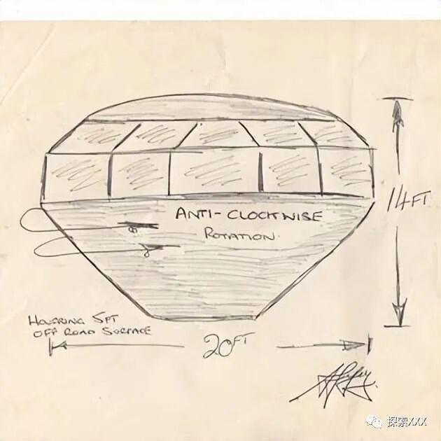 这个物体距离戈弗雷的警车不到20码,悬在距离路面约5英尺的地方。它是菱形的,看起来大约有20英尺宽,14英尺高。它的顶部还有一排黑色镶板。