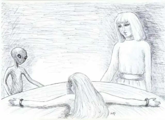 突然,我面前出现了一个爬虫类外星人。它有鳞状的皮肤,鼻子上有黑洞,还有一张小嘴。它不是很高——大约5英尺,但非常强壮。它抓住我的胳膊,把我拉向田野远处的一个圆盘。它把我拖进电梯,电梯门关上了。等我回过神来,我已经到了一个房间,里面有控制台、彩灯和四处走动的小人。我被扒光了,扔在床上。他们拿了一个非常可怕的尖锐的仪器,在我尖叫的时候把它按在我的身体上。之后的事我都不记得了。