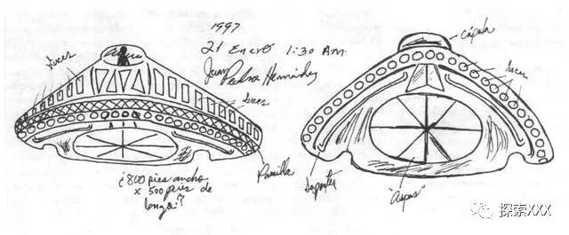 “还有,顺便说一下,那最后两艘船不能改变颜色,也不能把自己包裹在那光芒中。只有第一艘飞船把自己笼罩在光芒中,消失在太空里。另外两个没有。此外,第一艘飞船没有发出任何声音,也没有留下任何烟雾痕迹,但其他几艘飞船却在身后留下了一排烟雾......另外两艘飞船的后部有看起来像两个大的涡轮喷气机,这似乎是驱动它们的东西,它们发出的噪音。正如我们所知,喷气机发出的噪音。但另一艘飞船,第一艘没有。我对此绝对肯定。”