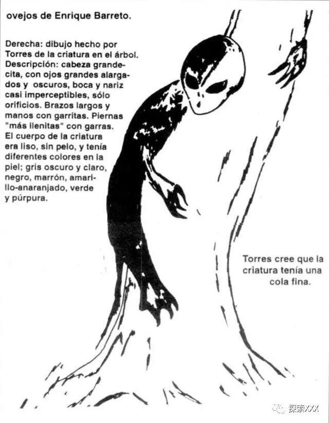 因为他听说在那个地区,他的兄弟和邻居还看到过UFO,所以他决定在那里守夜。一直到第二天早上6点的时候,他看到一个生物紧紧抓住附近一棵树的树枝。托雷斯形容它有一个大脑袋,没有毛,有细长的眼睛,小嘴巴和尖下巴。它的手臂细长,手上只有四根手指——手指末端是爪子。脚趾的数量和手指一样多,但比手指更小更粗。